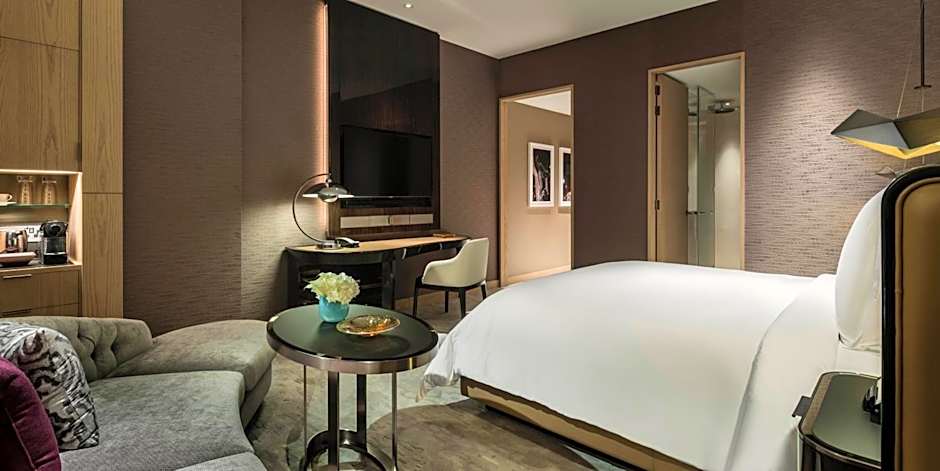 This twin room features a walk-in closet, sofa and limestone bathroom with views of DIFC